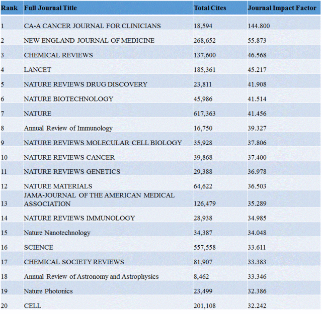2016年6月14日訊-- 北京時間6月14日,湯森路透《SCI期刊分析報告》(Journal Citation Reports)新鮮出爐。第一第二依然是CA-Cancer J Clin和NEJM,NATURE REVIEWS DRUG DISCOVERY此次排名上升為第三。第4-7位分別為Lancet,NATURE BIOTECHNOLOGY,NATURE REVIEWS IMMUNOLOGY,NATURE MATERIALS。